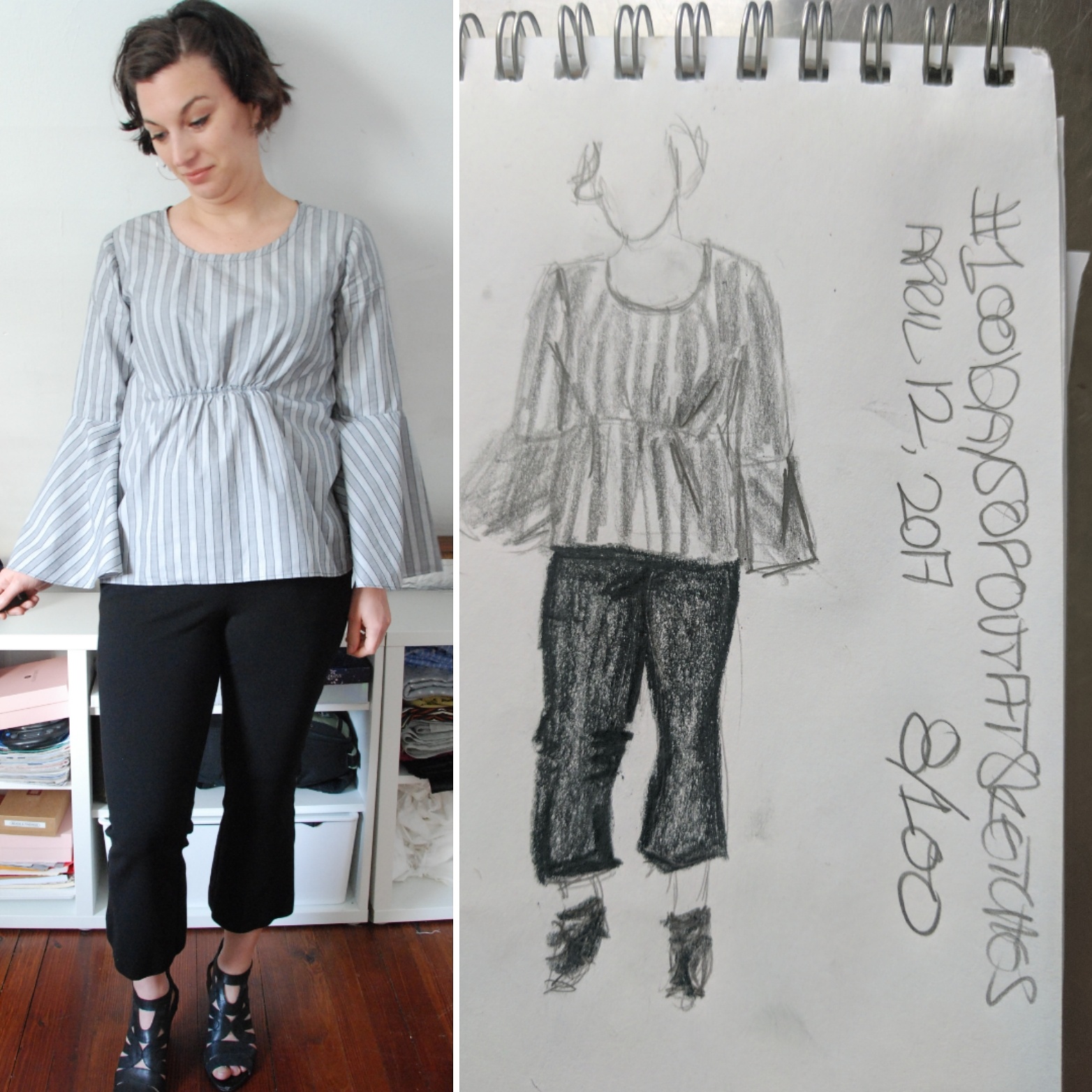 Day 4 was last Wednesday, which was an office day for me. I was originally intending to wear my leather espadrille sneakers (so it is basically the same outfit as day 2, but with different pants), but I figured I was pushing my staid engineering office a bit already with the dramatic sleeves, so I switched out for more professional looking shoes (relaxing the rules just a tad). The funny thing is that I've gotten plenty of comments on the shirt already, but at the office, I got several compliments on my shoes, but no one mentioned the shirt. :)